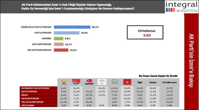 Araştırmanın bu iki başlığına ilişkin sonuçları ve iki veri arasında ortaya çıkan yüzde 15 oranındaki görüş değişikliğinin nedenlerini değerlendiren İntegral Araştırma; “ Hükümetin İzmir’i cezalandırdığı algısı ile CHP’li belediyelerin hizmetlerini engellediği algısı arasında her ne kadar paralellik görünse de; yüzde 15 olarak ortaya çıkan farkın doğru okunması gerektiğini vurguladı. Seçmenin, bu iki algıyı net bir şekilde birbirinden ayırdığını belirten İntegral, sonuçları; “ Öyle ki; İzmir seçmeni hükümetin kendisine daha çok ceza kestiğini düşünürken, belediyelere de hiç de azımsanmayacak oranda kendisi ceza kesmiştir. Demek ki; neredeyse 7 İzmirliden biri; CHP’nin idaresindeki yerel hizmetleri yetersiz bulmakta; bazı sorunların nedeninin de belediyeler olduğunu düşünmektedir.” İfadeleriyle yorumladı.