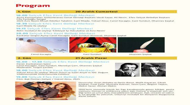 Açılışın ardından; Gani Müjde, Yüksel Aksu, Canol Kocagöz, Gani Sunduri ve Ohannes Şaşkal’a 2025 Aziz Nesin Mizah Ödülleri takdim edilecek. Saat 18.30’da Gani Müjde, 19.15’te ise Bekir Yurdakul, “Edebiyat İçi Yolculuklar ve Aziz Nesin” başlıklı söyleşileriyle izleyicilerle buluşacak.
